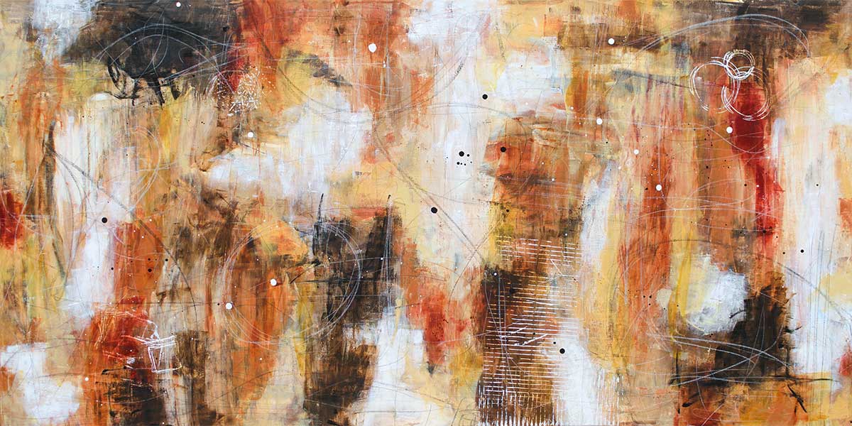 Farverne bevæger sig i et jordnært spektrum af mørk brun, varm okker og dybe, næsten sortbrune felter. Underliggende lag af lysere brun og beige træder frem enkelte steder og giver motivet dybde og en tydelig fornemmelse af opbygning. Overgangene er ikke flydende, men lagdelte, hvilket skaber en mere struktureret overflade, hvor farverne opleves som placeret oven på hinanden frem for blandet sammen.