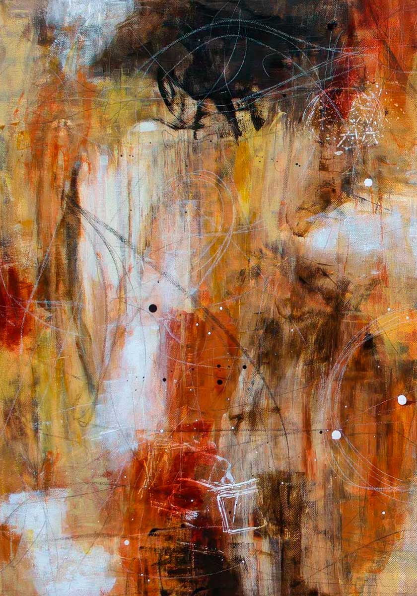 Her dominerer varme brune og kastanjefarvede toner, suppleret af mørkere, næsten sorte områder, som giver tyngde. Underliggende lag af lysere brun og støvet beige anes i kanter og gennem brud i overfladen, hvilket skaber dybde og variation. Farverne ligger i tydelige lag, og kontrasten opstår i forskellen mellem matte og mere mættede felter frem for i farvespring.