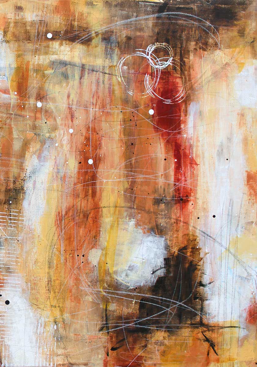 Farveskalaen består af varme brune nuancer kombineret med lysere sand- og beige toner. De mørkere brune lag fungerer som forankring, mens de lysere felter giver modspil og åbner billedfladen. Lagdelingen er tydelig, og man fornemmer, hvordan farverne er bygget op trin for trin, hvilket giver motivet dybde uden at virke tungt.