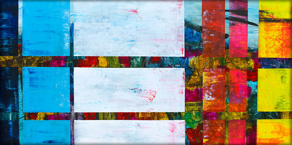 Akryl maleri med farver er et kunstværk, der udtrykker sig i en farvestrålende og levende stil. Kompositionen er opbygget med fine, faste linjer, der skaber struktur og retning, mens brudte former og blødere linjer tilfører værket en vis spontanitet og bevægelse. Det skaber en spændende balance mellem det kontrollerede og det frie, og inviterer beskueren ind i en verden fuld af visuelle lag og indre energi.