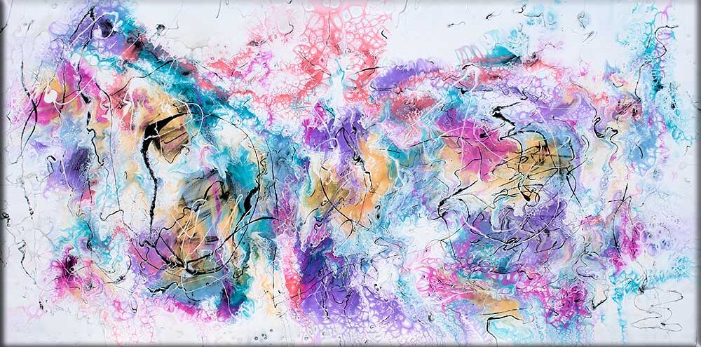 Akrylmaleri i moderne stilart med dejlige pastelfarver i lyspink, havgrønne, lyseblå og orange farvetoner .