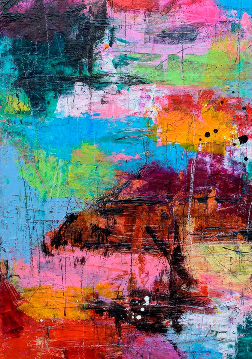 Udgangspunktet er et originalt maleri fra atelieret, oversat til plakatformat. Pouring teknik er brugt til at skabe de glidende farveovergange og de naturlige kanter mellem farvefelterne.