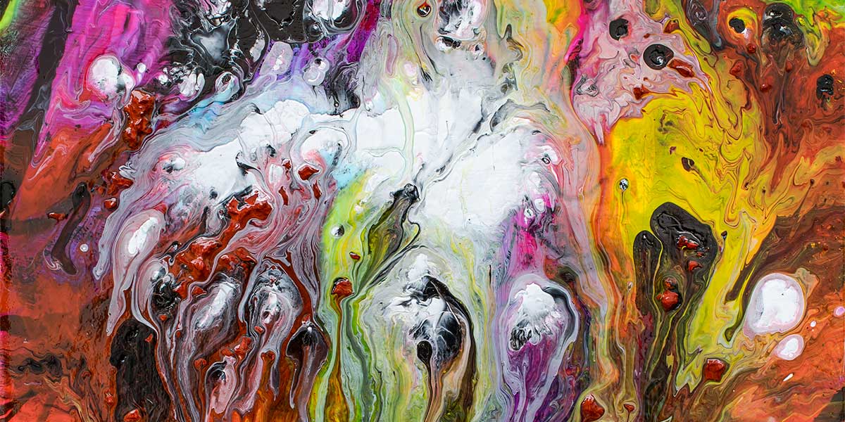 Farvepaletten består af intense og mættede toner i rød, pink og orange, suppleret af kølige blå, grønne og turkise nuancer. Farverne flyder sammen i bløde, organiske former og skaber en rig variation i både farvetæthed og kontrast. Lyse områder giver modspil til de stærke farver og tilfører dybde, mens samspillet mellem varme og kolde farver skaber balance i helheden.