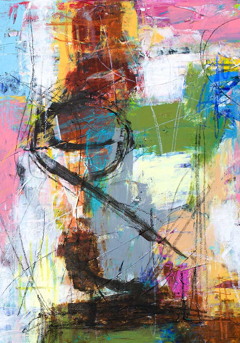 Farverne ligger på en lys base af kalkhvid, lys duegrå og varm flødefarvet hvid, som åbner billedet og giver plads til de mere markante felter. I øverste del ses varme nuancer af gylden okker, ravgylden og brændt sienna, mens midten rummer kølige felter i petrolblå, akvamarin og dæmpet turkis. Derudover optræder støvet rosa, lys koral og lavendel i de mere transparente områder, mens olivengrøn og salviegrøn skaber jordnære modspil på tværs af kompositionen. Mørkere partier i rå umbra, mokkabrun og næsten kulsort giver vægt til billedets centrale struktur og holder de mange farver samlet.