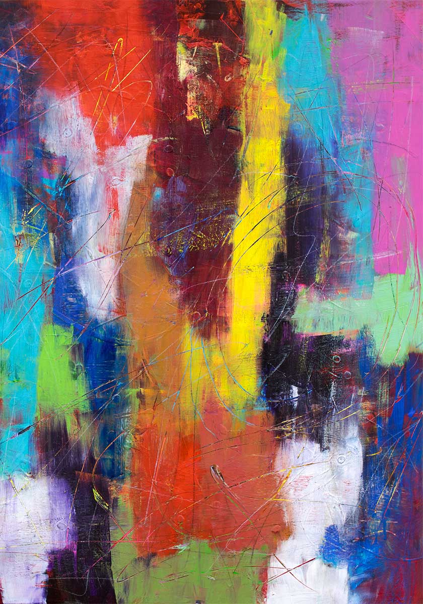 Abstrakt plakat med farver med et højenergisk og farvemættet lag-på-lag-udtryk, hvor lodrette felter og mørke spor holder en intens komposition samlet. Højformatet koncentrerer billedet og giver de mange farver en opadgående rytme, så motivet føles som en række lysende passager sat tæt side om side.