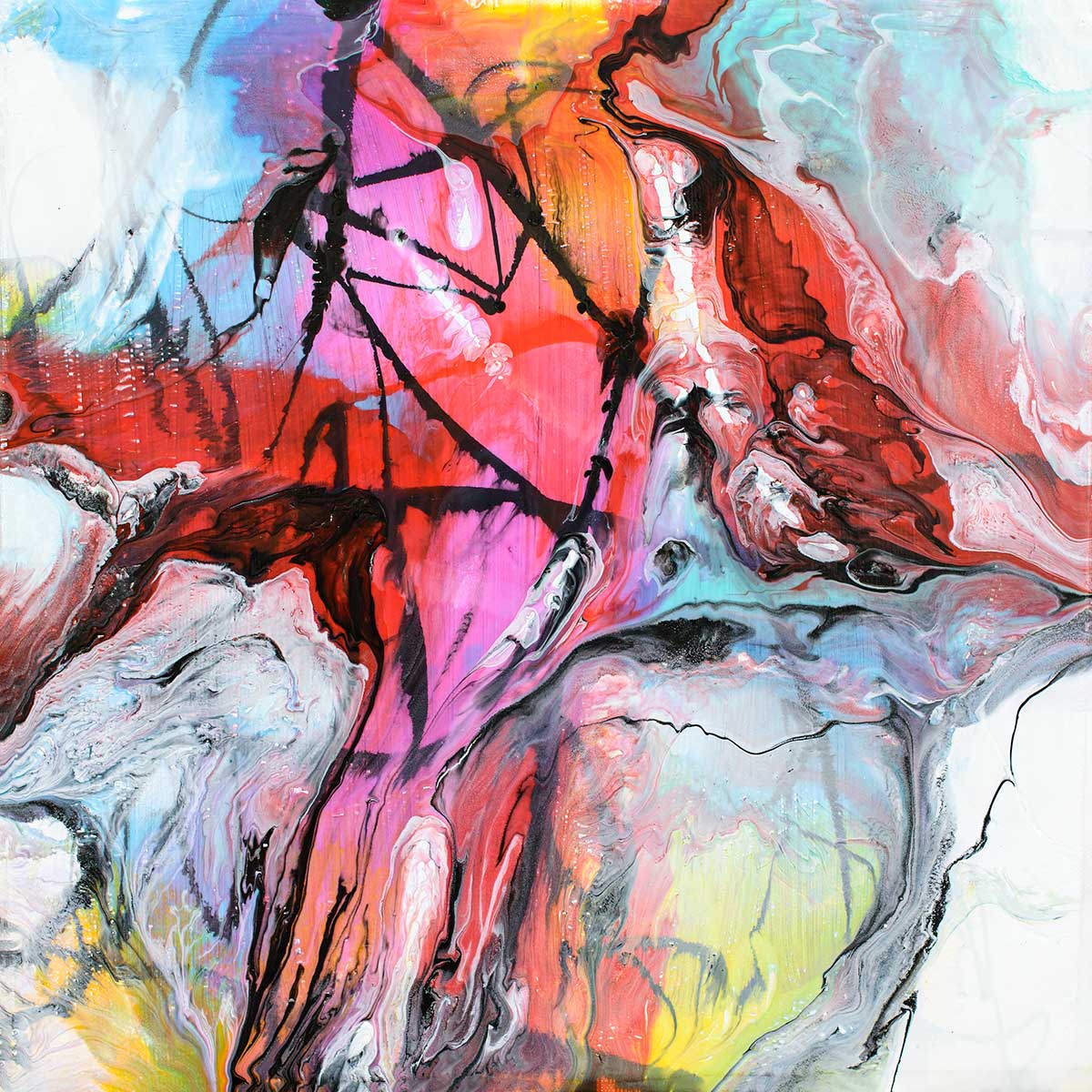 Farvepaletten består af mættede og klare nuancer af pink, rød og orange, kombineret med kølige toner i blå, turkis og grøn. Farverne flyder sammen i organiske former uden skarpe overgange og skaber et blødt, men levende udtryk. Lyse partier bryder farvefelterne og giver dybde, mens kontrasten mellem varme og kolde farver skaber en afbalanceret helhed.
