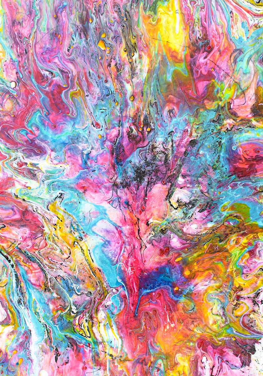 Farvepaletten er rig og nuanceret med lyse turkise og aqua-blå toner, varme solgule og okkerfarvede felter samt mættede pink, koral og dybere rødlige nuancer. Indslag af mørkere violette og næsten sorte partier skaber kontrast og dybde, mens de lysere, næsten pastelfarvede områder tilfører lethed og balance. Samspillet mellem kraftige og mere transparente farvelag giver motivet et levende og dynamisk udtryk.