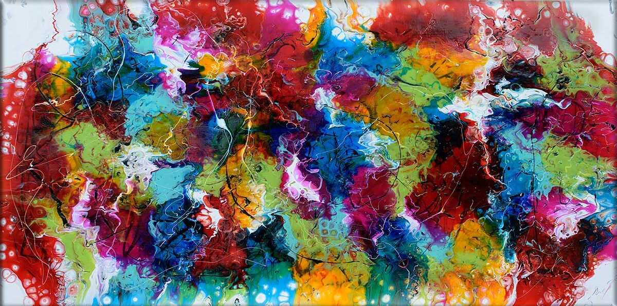 Farverne i kompositionen er rige og balancerede. Røde, pink, grønne, orange og blå nuancer skaber en intens og dynamisk helhed, hvor hver farve bidrager med sin egen stemning. De skarpe kontraster tilfører værket kraft og dybde, mens de flydende overgange skaber harmoni og bevægelse. Farverne mødes i et poetisk samspil, der vækker sanserne og giver maleriet et tidløst udtryk.