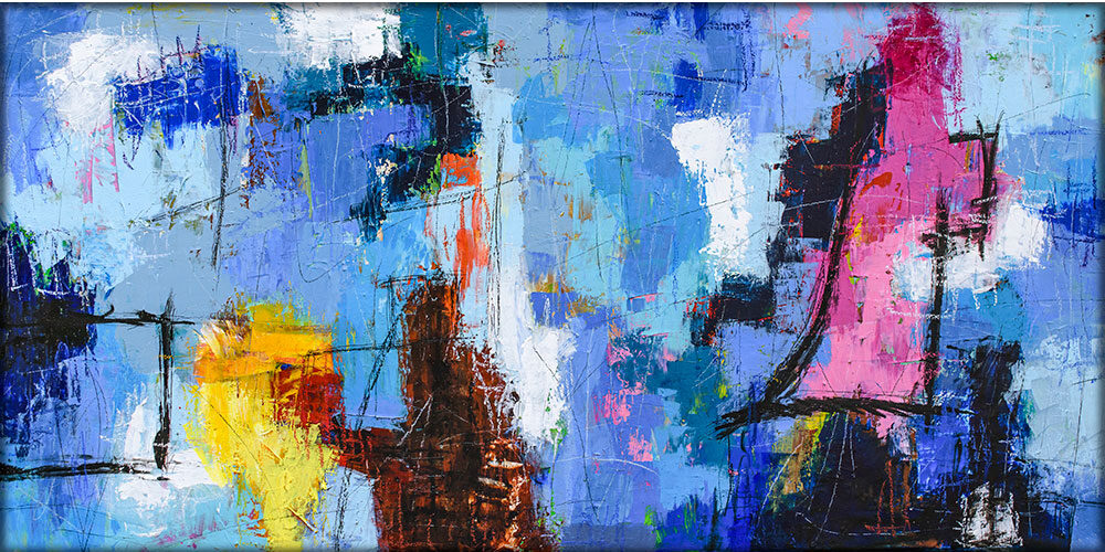 Farverne i værket er en flot sammensætning af blå toner, smukt suppleret af lyserøde, brune og gule nuancer. De blå farver danner et roligt og afbalanceret fundament, mens de lyserøde og gule detaljer bringer varme og liv. De brune nuancer skaber dybde og struktur, som giver motivet en naturlig jordforbindelse. Samspillet mellem skarpe kontraster og bløde overgange giver værket et levende, men samtidig harmonisk udtryk, der forandres med lyset og rummets atmosfære.