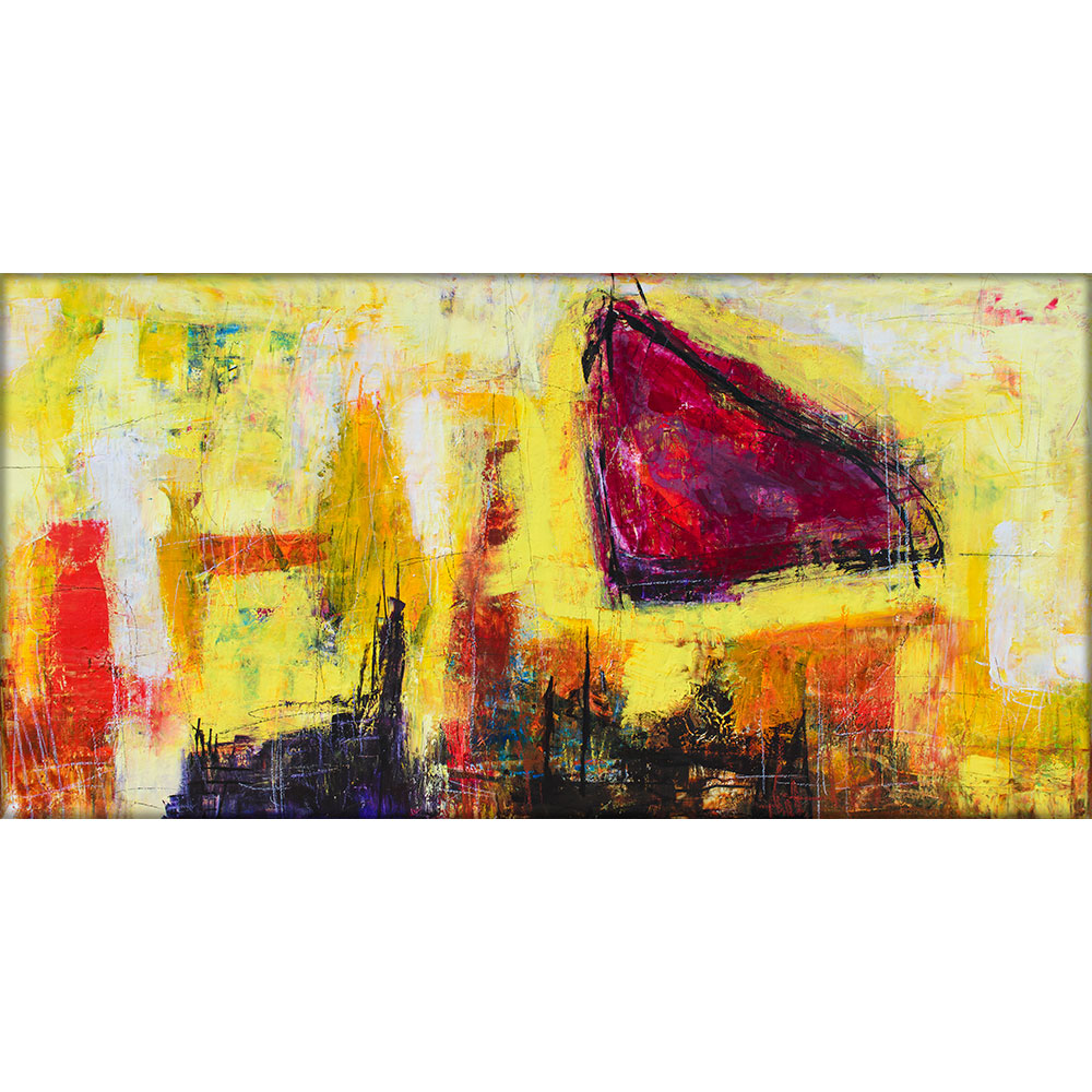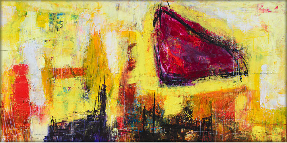 Farvepaletten er domineret af gyldne og gule toner, som udstråler lys og varme. De understøttes af nuancer af rød, orange, bordeaux og brun, der giver værket dybde og karakter. Kontrasterne mellem de kraftige farver og de bløde overgange skaber en fascinerende visuel oplevelse, hvor blikket naturligt bevæger sig gennem kompositionen og opdager nye detaljer for hver betragtning.