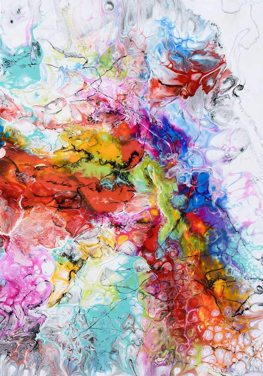 Motivet er baseret på et originalt maleri skabt i atelieret og gengivet her som plakat. Værket er udført med pouring teknik, hvor flydende akrylfarver danner de karakteristiske mønstre og overgange.