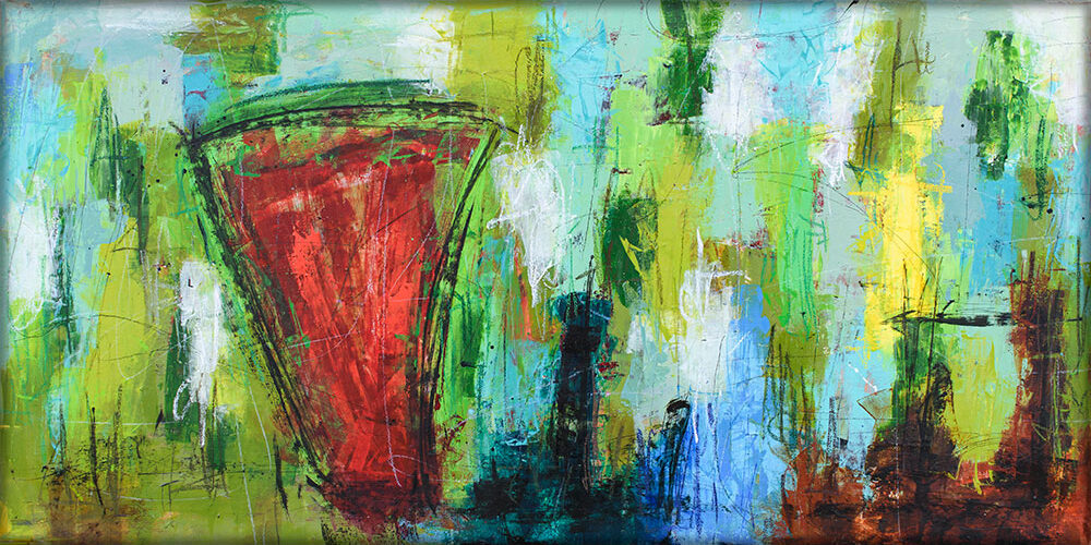 Farvepaletten i dette værk er centreret omkring de grønne toner, som spænder fra bløde, beroligende nuancer til dybere, mere kraftfulde farver. Disse grønne toner er suppleret af kontraster i blå, rød og gul, der giver en visuel variation og skaber en harmonisk, men samtidig energisk helhed. Overgangene mellem de skarpe kontraster og de bløde, flydende farvefelter fremhæver maleriets rytme og bevægelse. Denne kombination gør værket ideelt til at skabe stemning og personlighed i både moderne og klassiske indretninger.