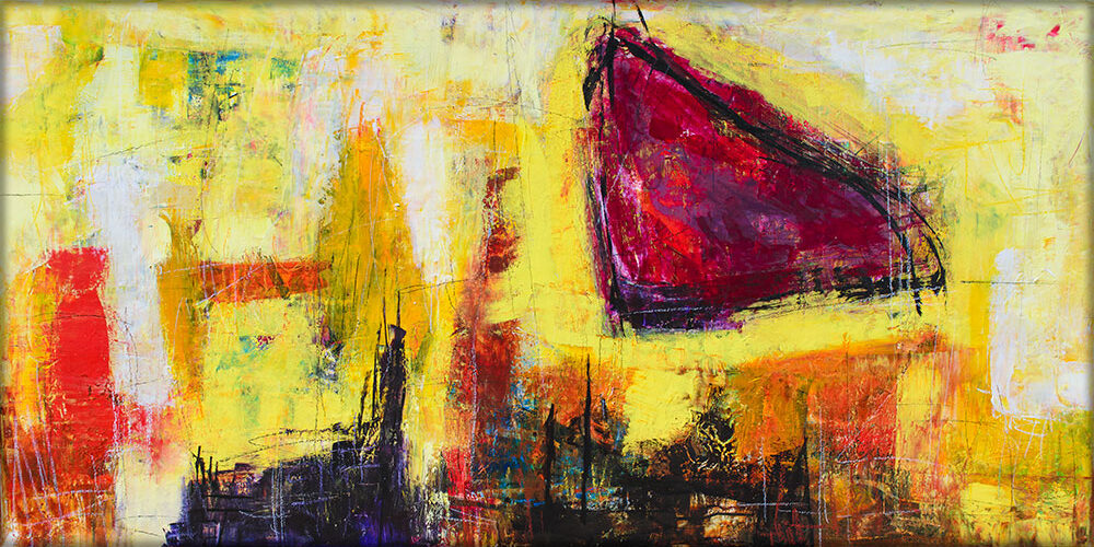 Gult maleri i flotte farver, skabt i en tidsaktuel stil, hvor kompositionen balancerer mellem faste og brudte linjer. De skarpe konturer skaber struktur og orden, mens de mere bløde og uregelmæssige former tilføjer dynamik og bevægelse til værket. Denne kombination giver maleriet et levende udtryk, der konstant inviterer øjet til at udforske nye detaljer. Helhedsindtrykket er moderne og stilfuldt, hvilket gør det til et perfekt fokuspunkt i både private og professionelle rum.