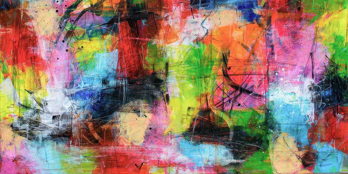 Kæmpe stor plakat med et eksplosivt abstrakt motiv, hvor farverne breder sig over billedfladen i brede og energiske bevægelser. Det store format gør kompositionen monumental og giver plads til de mange farvelag.