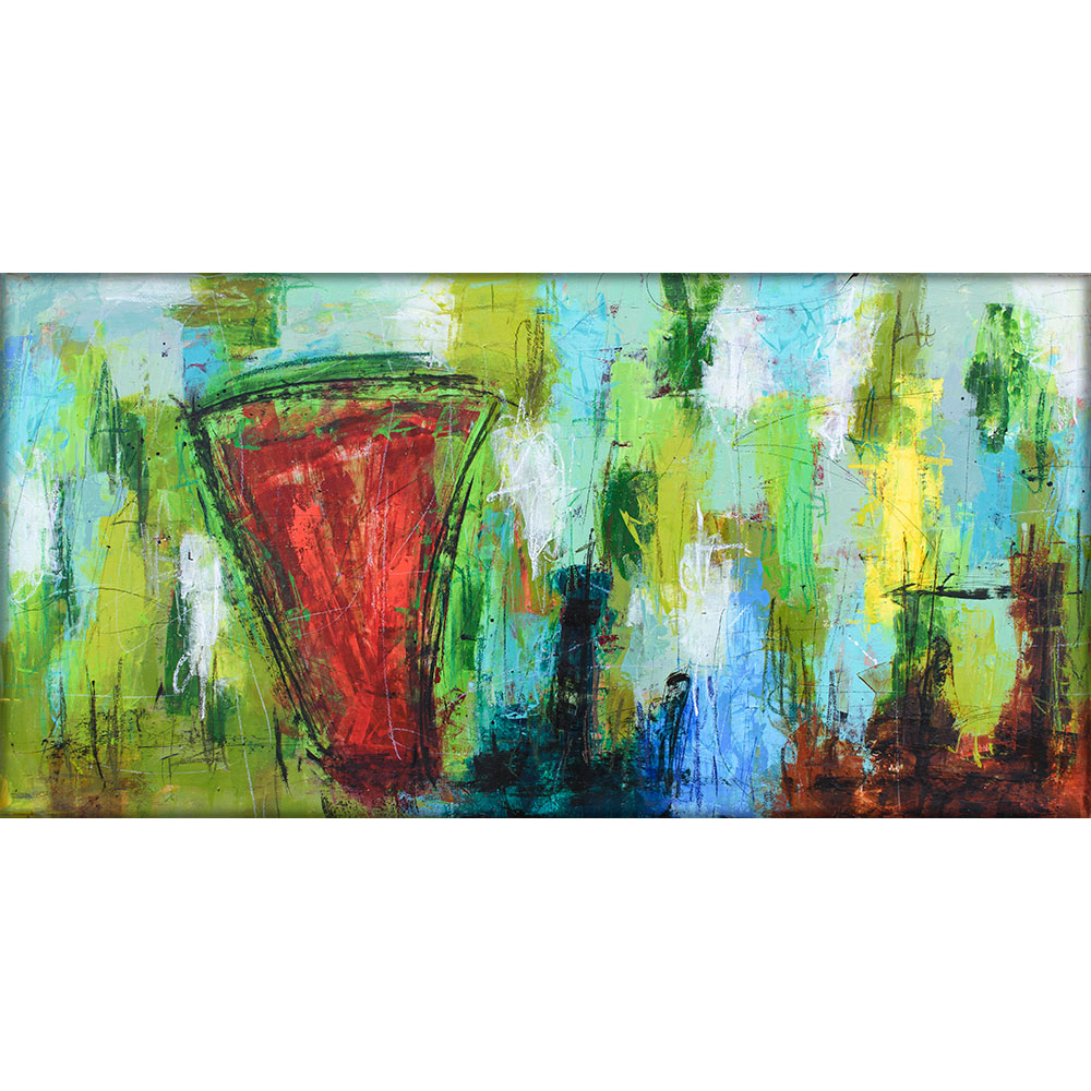 Farvesammensætningen er en intens og harmonisk kombination af grønne nuancer, der danner værkets kerne. De understøttes af røde, blå, brune og gule farvetoner, som tilfører variation og balance. De skarpe kontraster mellem farverne skaber energi og dynamik, mens de flydende overgange giver ro og bevægelse. Resultatet er et udtryk, der både føles levende og afbalanceret – fuld af lys, varme og stemning.