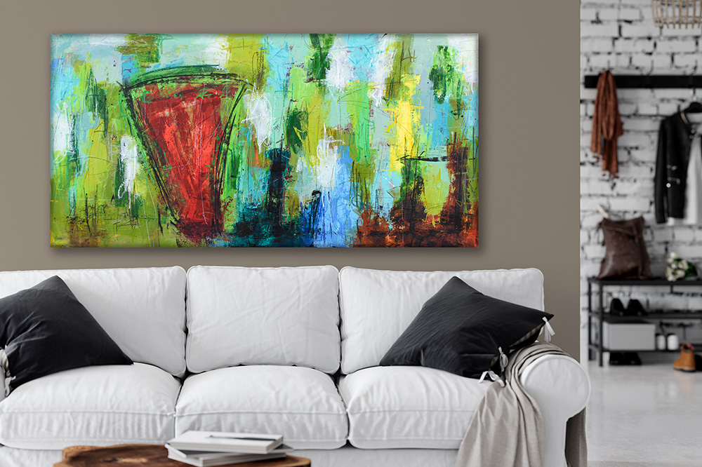Kæmpe lærredstryk er et stemningsfuldt kunstværk i en farvestrålende og moderne stil. Motivet udtrykker både energi og ro og skaber et levende centrum i rummet. De mange farvelag og bløde bevægelser giver værket dybde og karakter, mens det store format gør det ideelt som blikfang i stuen, receptionen eller andre rum, hvor kunsten får lov at dominere.