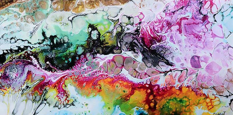 Farvesammensætningen i dette kunsttryk er både harmonisk og dynamisk. Kombinationen af pink, lysegrønne og orange nuancer skaber en flot kontrast samtidig med, at farverne glider elegant over i hinanden. Denne balance mellem markante farvefelter og bløde overgange fremhæver motivets former og linjer, hvilket giver billedet dybde og energi. Farverne træder tydeligt frem på lærredet, hvilket gør værket visuelt tiltalende og til et spændende fokuspunkt i ethvert rum, hvor det placeres.