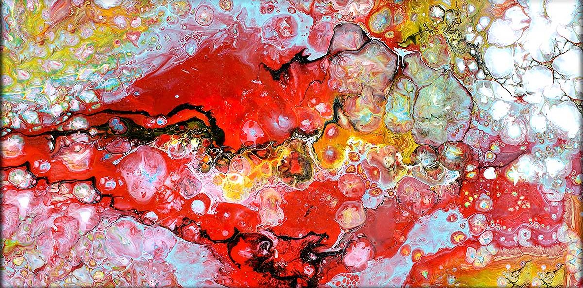Farvesammensætningen i motivet er en harmonisk blanding af røde, lysegrønne, orange og lyseblå nuancer. De skarpe kontraster mellem farverne skaber dynamik og liv, mens de bløde overgange sørger for en naturlig sammenhæng, som giver værket balance og dybde. Kombinationen af varme og kølige toner tilføjer en følelse af energi uden at blive overvældende, hvilket sikrer, at værket både fanger og fastholder opmærksomheden.