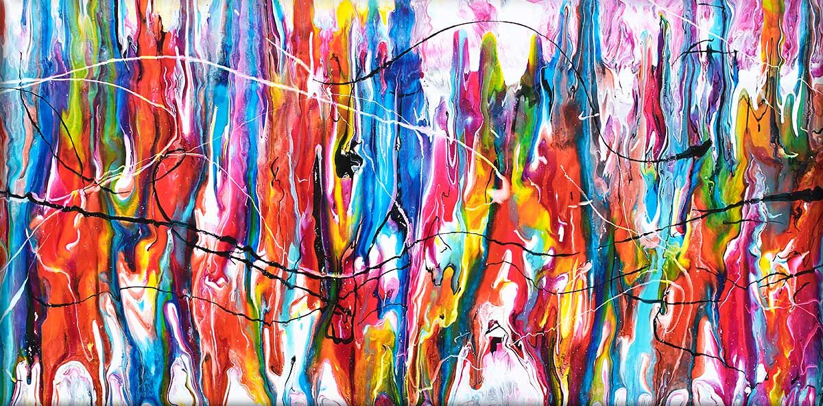 Farveuniverset i billedet rummer en intens og velafstemt blanding af røde, pink, turkis, grønne, orange og blå toner. De forskellige nuancer spiller sammen i et balanceret samspil, hvor nogle områder fremstår med skarpe kontraster og klare opdelinger, mens andre flyder roligt og blødt sammen i glidende overgange. Denne sammensætning skaber en sanselig dybde og en rytme i værket, der gør det levende og dragende, og som fanger opmærksomheden fra forskellige vinkler i rummet.