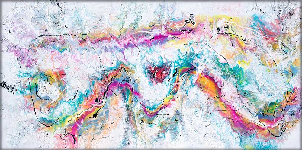 Lærredsbillede i pastelfarver der udstråler liv og elegance med sine dejlige pastelfarver. De blide nuancer af lyspink, havgrøn, lyseblå og orange smelter sammen i et farvestrålende udtryk, der både fænger og inspirerer beskueren, og symboliserer en harmonisk balance mellem tradition og nyskabelse.