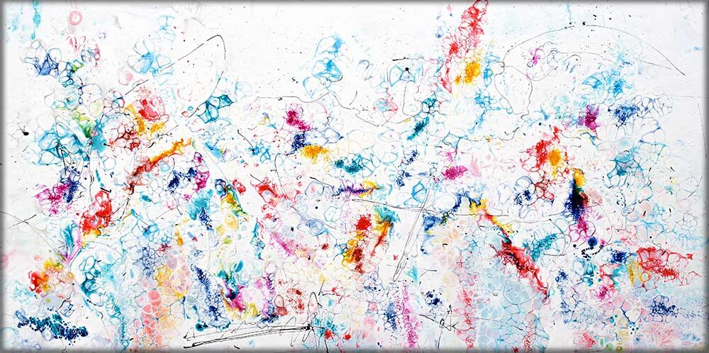 Motivet fremstår i en flot kombination af røde, blå, grønne og gule farvenuancer, hvor både skarpe kontraster og bløde, flydende overgange spiller sammen. Denne harmoniske farvepalet skaber liv og energi i billedet og gør det visuelt dragende fra alle vinkler. Farverne er nøje afstemt, så de fremhæver linjer og former på lærredet, og samtidig giver de rummet en frisk og moderne atmosfære, der både kan fungere som fokuspunkt og som en subtil del af indretningen.
