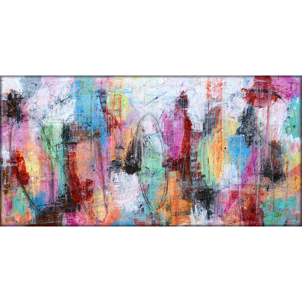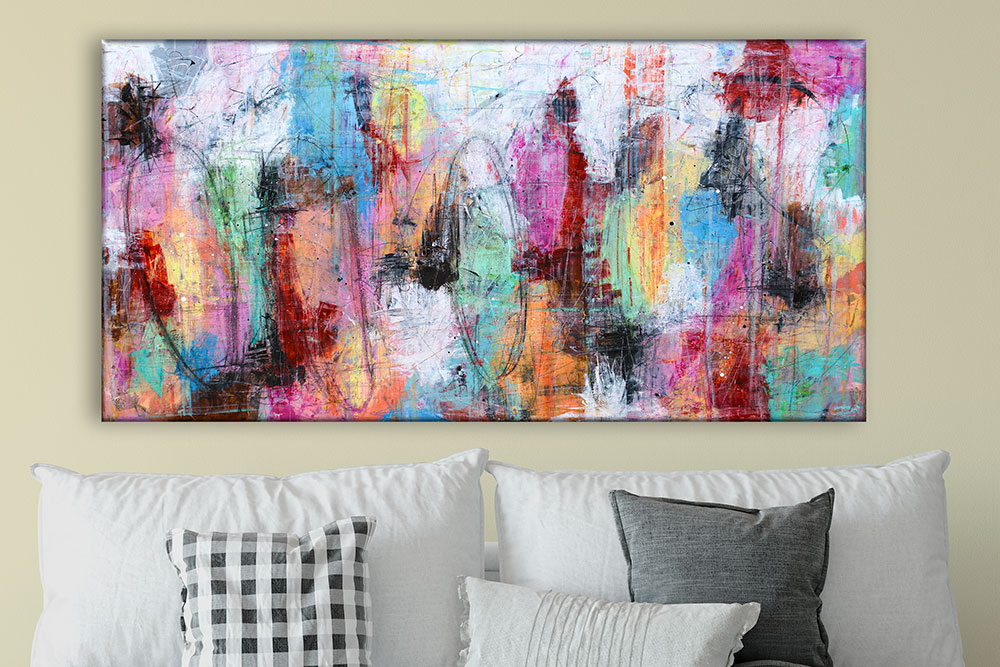 Farverne i værket udgør en flot sammensætning af røde, lyserøde, lysegrønne, lyseblå, lysegule og brune nuancer. De mødes i et harmonisk spil af kontraster og bløde overgange, som giver dybde og varme. De røde og lyserøde toner tilfører liv og passion, mens de grønne og blå farver skaber ro og lethed. De lysegule og brune nuancer binder helheden sammen og giver en naturlig balance, der ændrer karakter alt efter lysets retning og rummets stemning.
