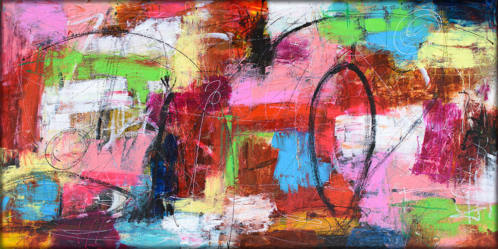 Farvesammensætningen er en smuk balance mellem røde og lyserøde toner, der fremhæves af lyseblå, lysegrønne, lysegule og orange nuancer. De varme farver tilfører liv og intensitet, mens de køligere toner bringer ro og balance. Farverne flyder sammen i bløde overgange, men brydes samtidig af skarpe kontraster, som skaber dybde og bevægelse. Resultatet er et udtryk, der opleves forskelligt alt efter lysets retning og rummets atmosfære – levende, men stadig harmonisk.