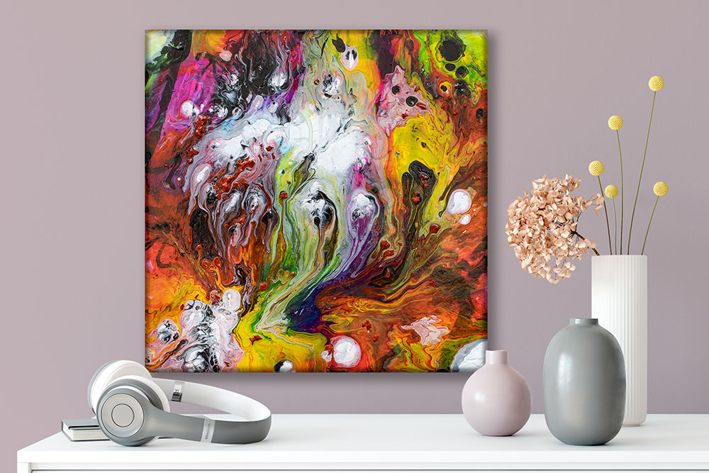 For at beskytte farverne og fremhæve dybden i motivet er overfladen behandlet med to lag beskyttende lak. Denne behandling skaber en diskret silkemat glød, som intensiverer farverne og giver maleriet en elegant finish. Samtidig beskytter lakken effektivt mod UV-stråler, støv og daglig påvirkning, så værket bevarer sin klarhed og styrke i mange år fremover. Dette sikrer en overflade, der både er smuk og holdbar.