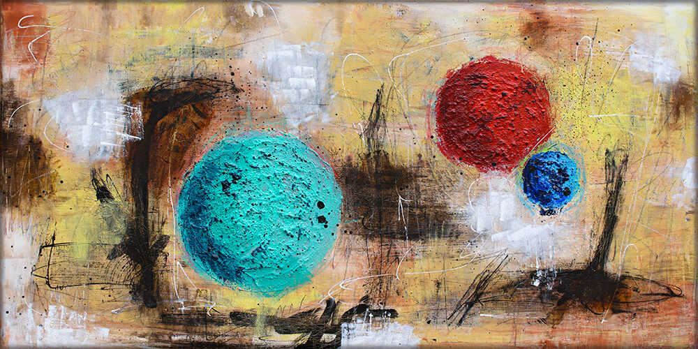 Farvepaletten er centreret omkring varme og jordnære brune nuancer, som danner fundamentet for billedets atmosfære. Disse toner er smukt suppleret med indslag af rød og turkis, der bringer liv og kontrast til værket. De skarpe farvespring blander sig med bløde overgange, så maleriet får en naturlig rytme og dybde. Farvesammensætningen skaber et afbalanceret og samtidig overraskende udtryk, der kan fungere som et æstetisk fokuspunkt i både stue, kontor eller entré.