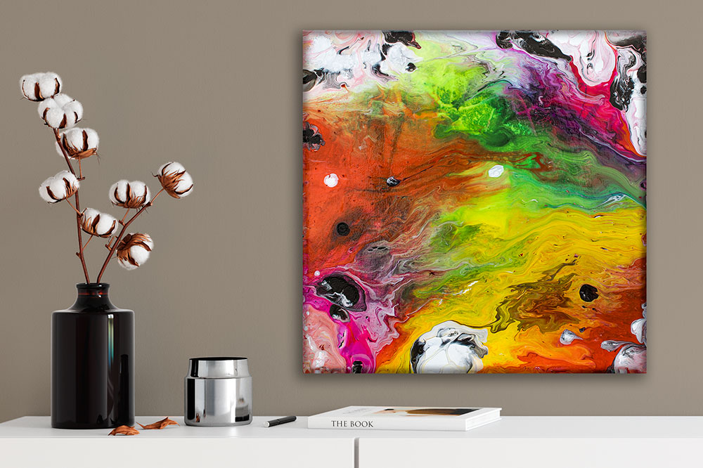 Farvesammensætningen er en harmonisk blanding af røde, pink, blå, orange, gule og grønne nuancer, som skaber en fortryllende visuel oplevelse. De stærke farver står i spændende kontrast til hinanden, men smelter samtidig sammen i flydende overgange, der giver motivet et levende og nærmest pulserende udtryk. Resultatet er et maleri, der både kan lyse et rum op og tilføre dybde, uanset om det hænger alene eller indgår i en kunstnerisk gallerivæg.