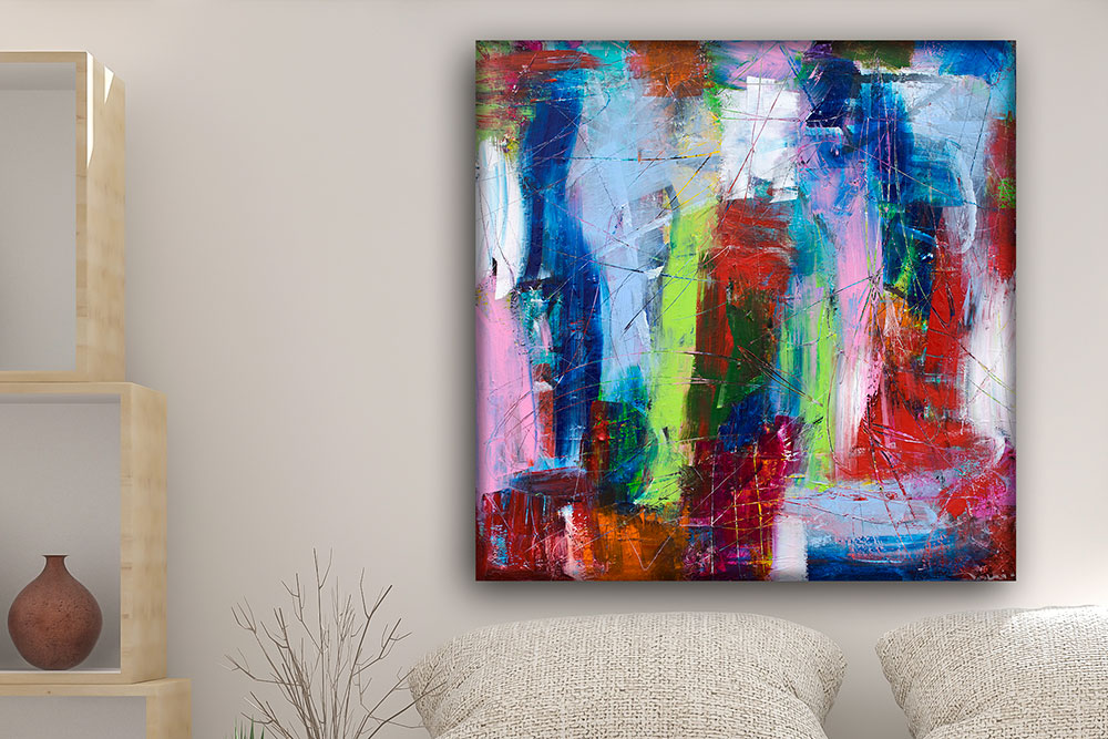 Overfladen er behandlet med to lag UV-resistent klarlak, som beskytter værket mod sollys, støv og snavs. Lakken fremhæver farvernes intensitet og giver en elegant, silkemat finish, der understøtter maleriets udtryk. Denne beskyttelse forlænger værkets levetid og bevarer dets oprindelige friskhed, selv i rum med varierende lysforhold. Resultatet er et kunstværk, der forbliver levende og farvestærkt over tid.