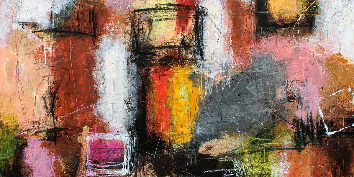 Formerne fremstår som byggede felter, portallignende åbninger og rektangulære fragmenter, der næsten kan lede tanken hen på byrum, facader eller vægpartier. Mørke sorte og brunlige konturer ligger omkring flere af de centrale felter og giver kompositionen struktur. På tværs af dem løber tynde ridser, fine streger og skrabede spor, som skaber aktivitet uden at forstyrre helheden. Overfladen veksler mellem transparente slør og mere dækkende lag, så billedet både har luft og vægt. Her er lag på lag-karakteren tydelig i den måde, de lyse partier stadig lader underliggende farver ane, mens de mørke markeringer binder det hele sammen.