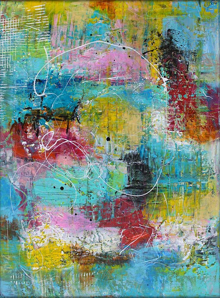 Farvesammensætningen byder på klassiske farvetoner med en blanding af røde, lyserøde, aquagrønne, lyseblå og gule nuancer. Disse farver står i smuk kontrast til hinanden, hvilket fremhæver hver nuance og giver maleriet en intens dybde. Farverne flyder ind i hinanden og skaber flydende overgange, som tilfører en følelse af bevægelse og liv. De klassiske farver kombineret med moderne teknikker gør maleriet velegnet til at skabe et unikt og stemningsfuldt udtryk i rummet.