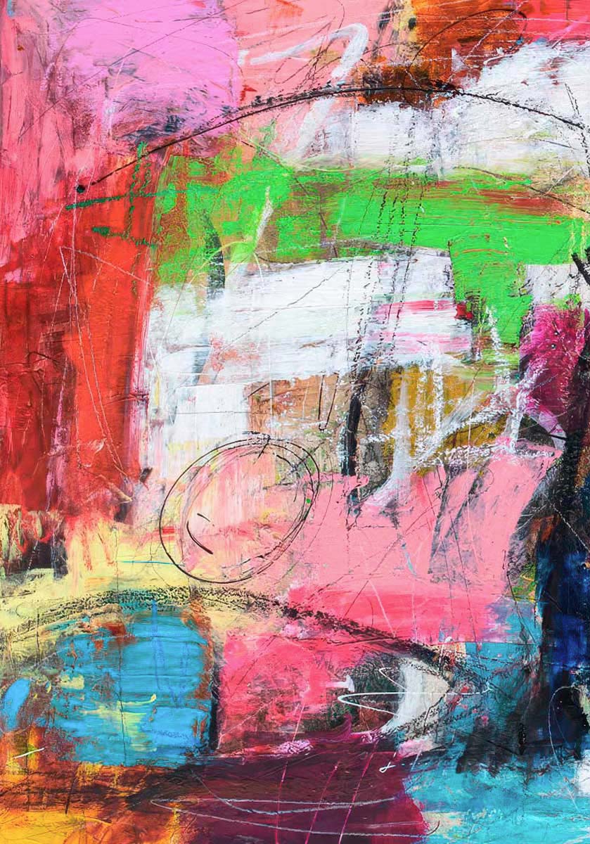 Farverne ligger i et stærkt, men overraskende afbalanceret spænd mellem varme og kølige felter. Særligt fremtrædende er de store partier i candy pink, lys magenta og koralrosa, som fylder store dele af fladen og giver billedet en varm, næsten glødende tone. Disse mødes af tomatrød, cinnoberrød og lidt mørkere hindbærrøde zoner mod venstre og nederst, hvor farven bliver mere tæt og mættet. På tværs af de varme områder ligger et tydeligt bånd af limegrøn, æblegrøn og chartreuse i midten, som skaber frisk kontrast, mens cyan, turkis og lys akvamarin åbner billedet nederst og langs højre side. Brede felter af kalkhvid og kridthvid holder kompositionen lys, og enkelte mørkere partier i blåsort og grafit giver dybde omkring kanter og overgange.