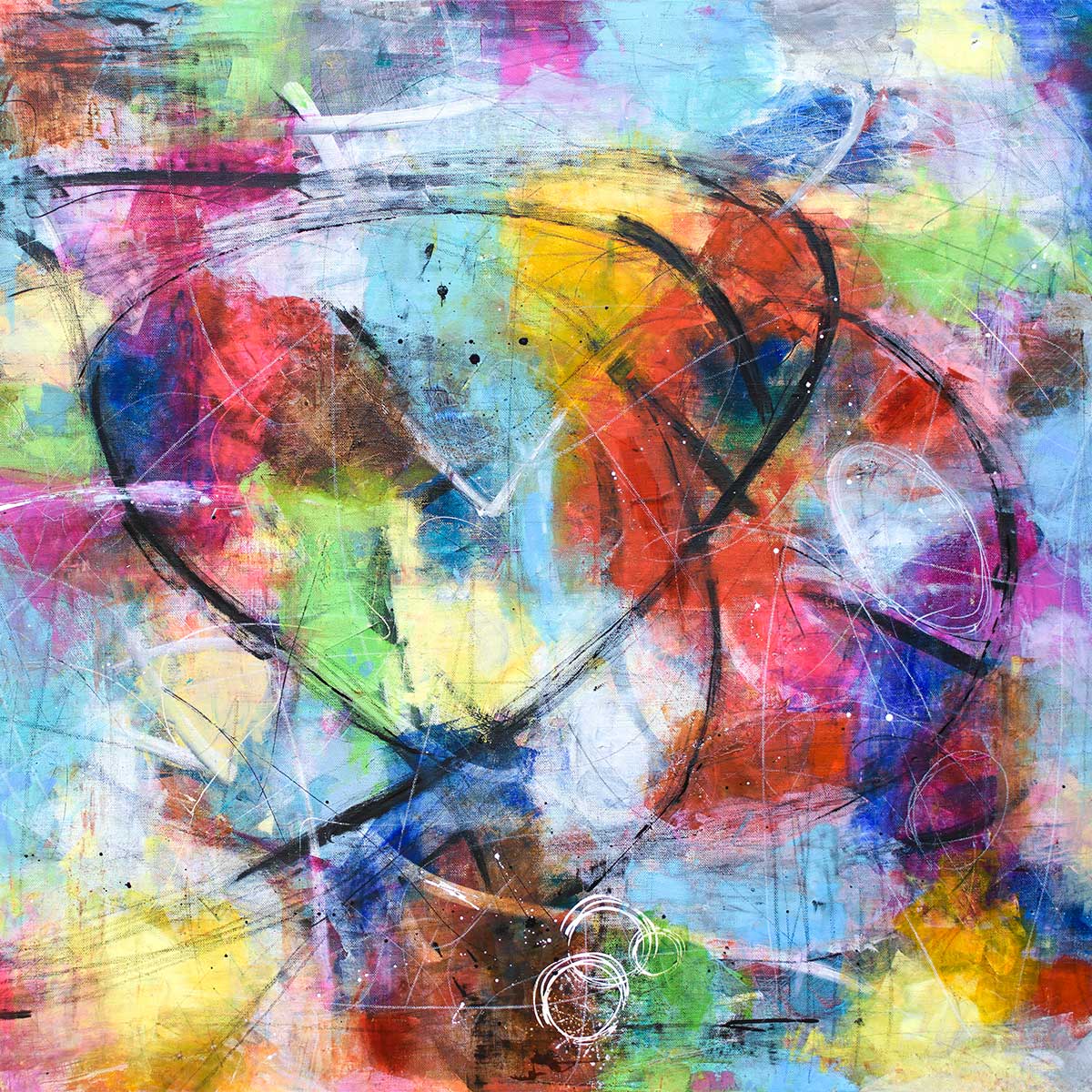 Farverne er komponeret i en harmonisk, men kraftfuld sammensætning med nuancer af blå, røde, pink, grønne, gule og orange. Disse farver balancerer smukt mellem skarpe kontraster og bløde overgange, hvilket giver en flot visuel dybde. Plakaten får gennem farvevalget et energisk og levende udtryk, som kan bringe varme og kreativitet ind i både private hjem og professionelle rum. Den farverige stil skaber blikfang og tilføjer karakter til ethvert miljø.