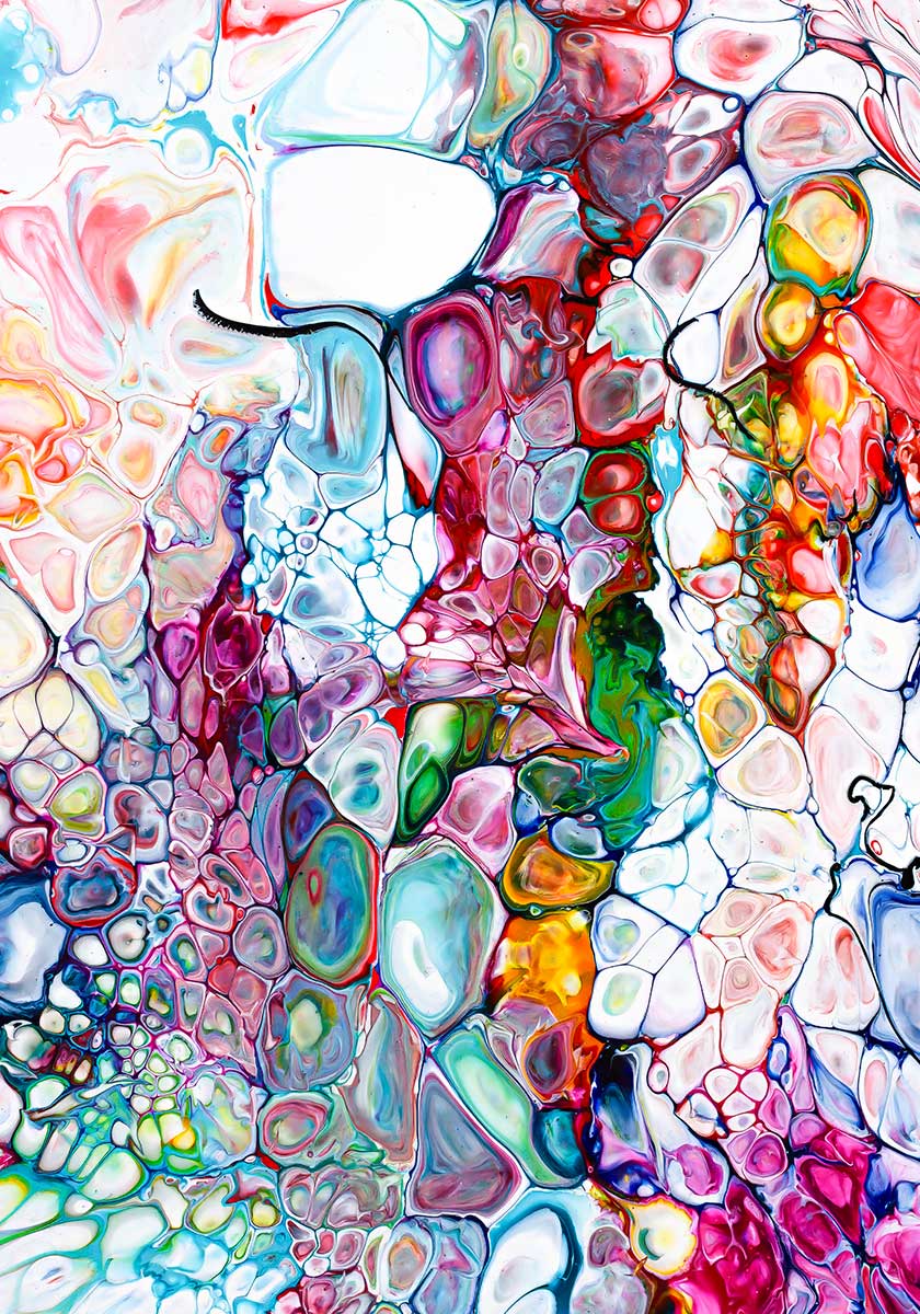Plakat til stuen med et rigt og detaljeret abstrakt motiv, hvor organiske, cellelignende former ligger tæt og danner et levende mønster på tværs af fladen. De afrundede former og fine, flydende konturlinjer kan give associationer til naturlige strukturer som mineraler, koraller eller mikroskopiske udsnit, hvor motivet opleves både komplekst og harmonisk i sin helhed.