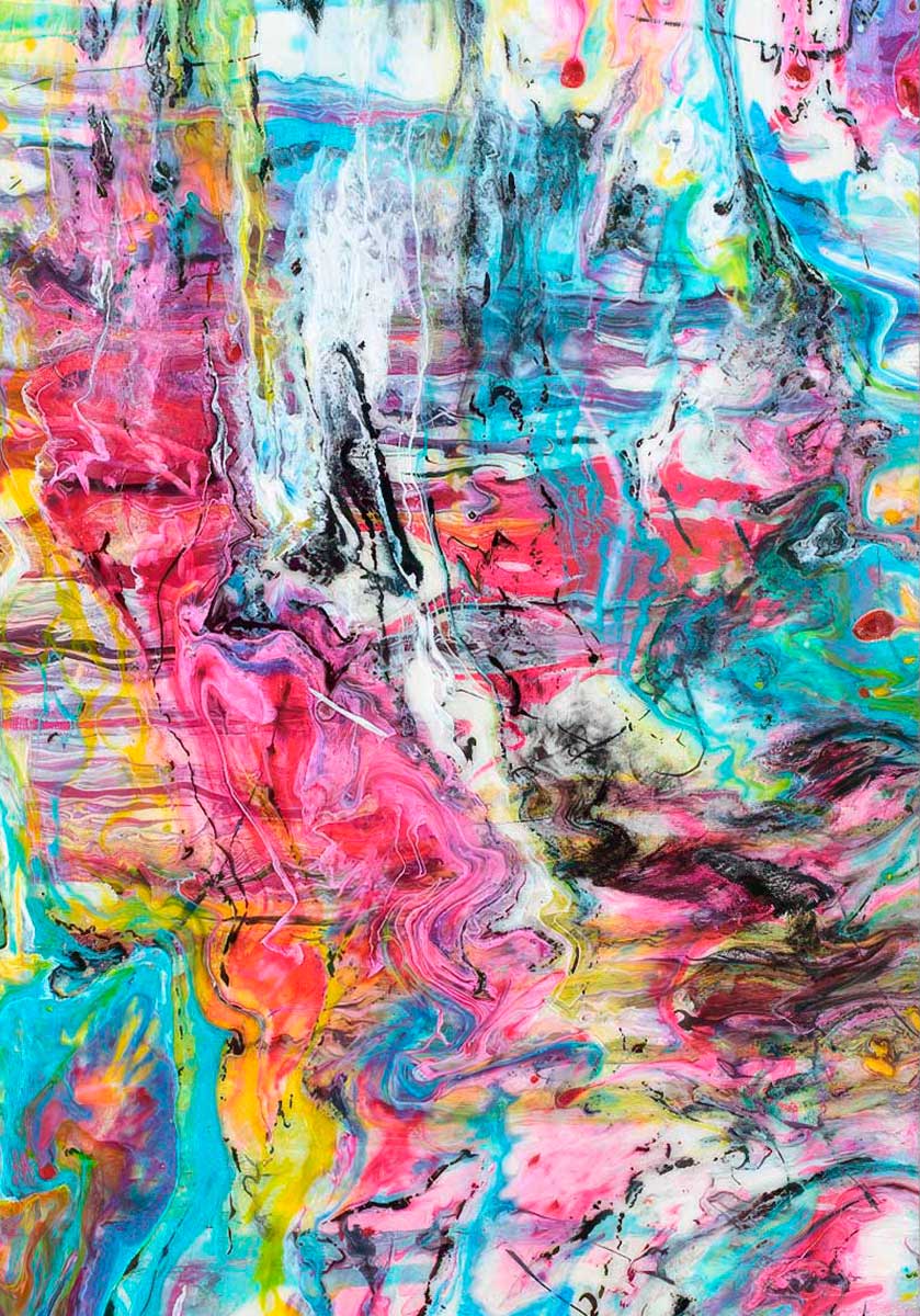 Motivet er baseret på et originalt maleri skabt i atelieret og gengivet som plakat. Pouring teknikken giver de bløde overgange og naturlige strukturer i farverne.