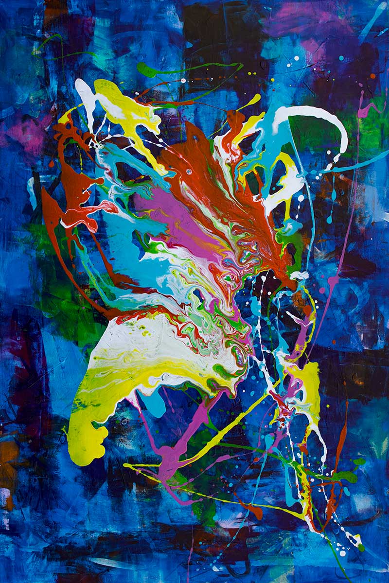 Motivet stammer fra et originalt maleri skabt i atelieret. Lag på lag teknikken giver baggrunden dybde og gør de mange farvelag tydelige i overfladen.