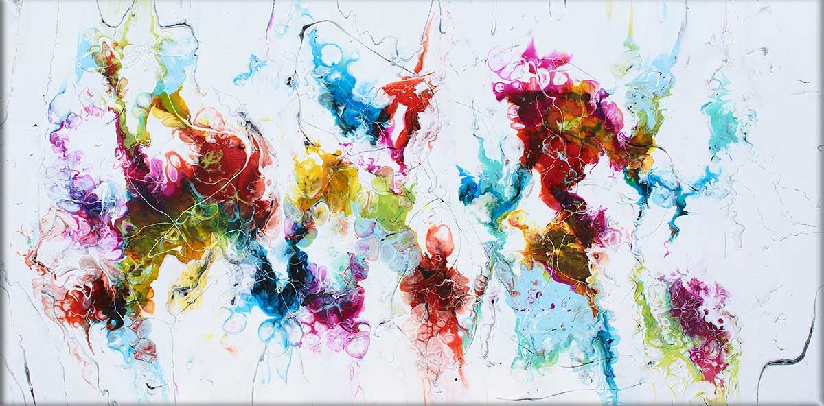 Store abstrakte malerier i lysstærke farvetoner, er flot vægdekoration der komplementere hjemmets øvrige indretning og farverne på møbler og boligtekstiler.