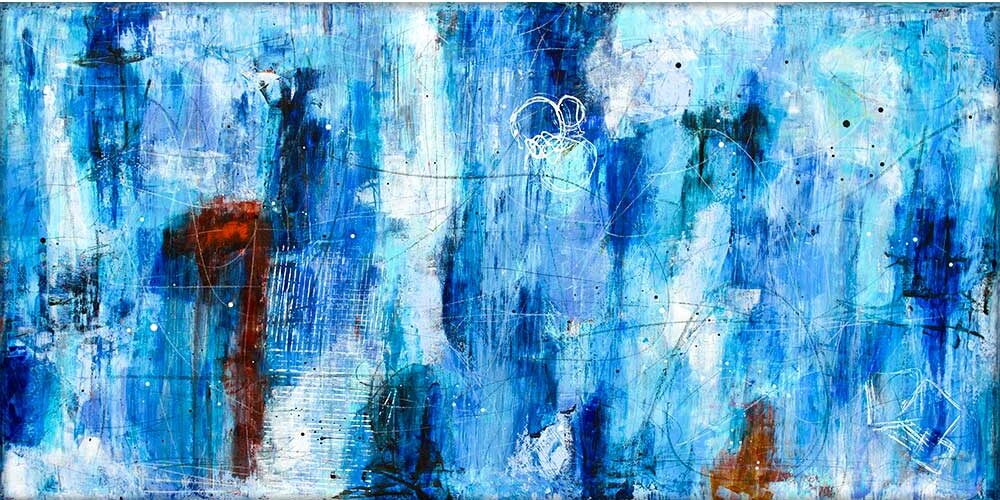 Farvespillet i værket er domineret af forskellige blå toner, der spænder fra klare og lyse nuancer til dybe og mørkere farver. Denne variation skaber en stemningsfuld balance mellem intensitet og ro. Skarpe kontraster brydes af flydende overgange, som giver maleriet en meditativ og drømmende karakter. Farverne åbner op for en visuel oplevelse, hvor øjet glider ubesværet gennem billedets lag og nuancer. Det blå udtryk skaber en atmosfære af friskhed, dybde og ro i rummet.