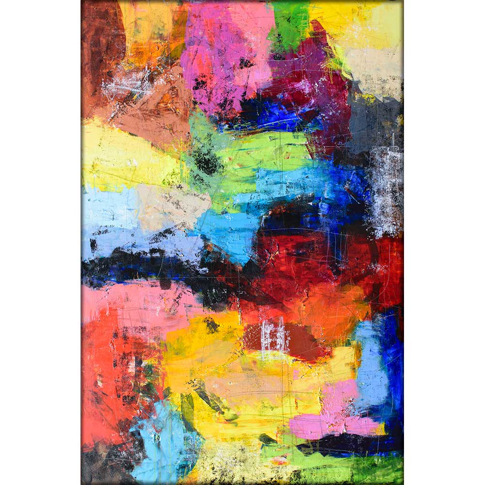 Farvesammensætningen er en levende og afbalanceret blanding af røde, gule, blå, grønne og brune nuancer. De varme og kølige farver skaber en fascinerende kontrast, hvor intensitet og ro eksisterer side om side. De skarpe farvemøder tilfører værket energi, mens de flydende overgange skaber harmoni og blødhed. Resultatet er et udtryk fyldt med rytme, balance og emotionel dybde.