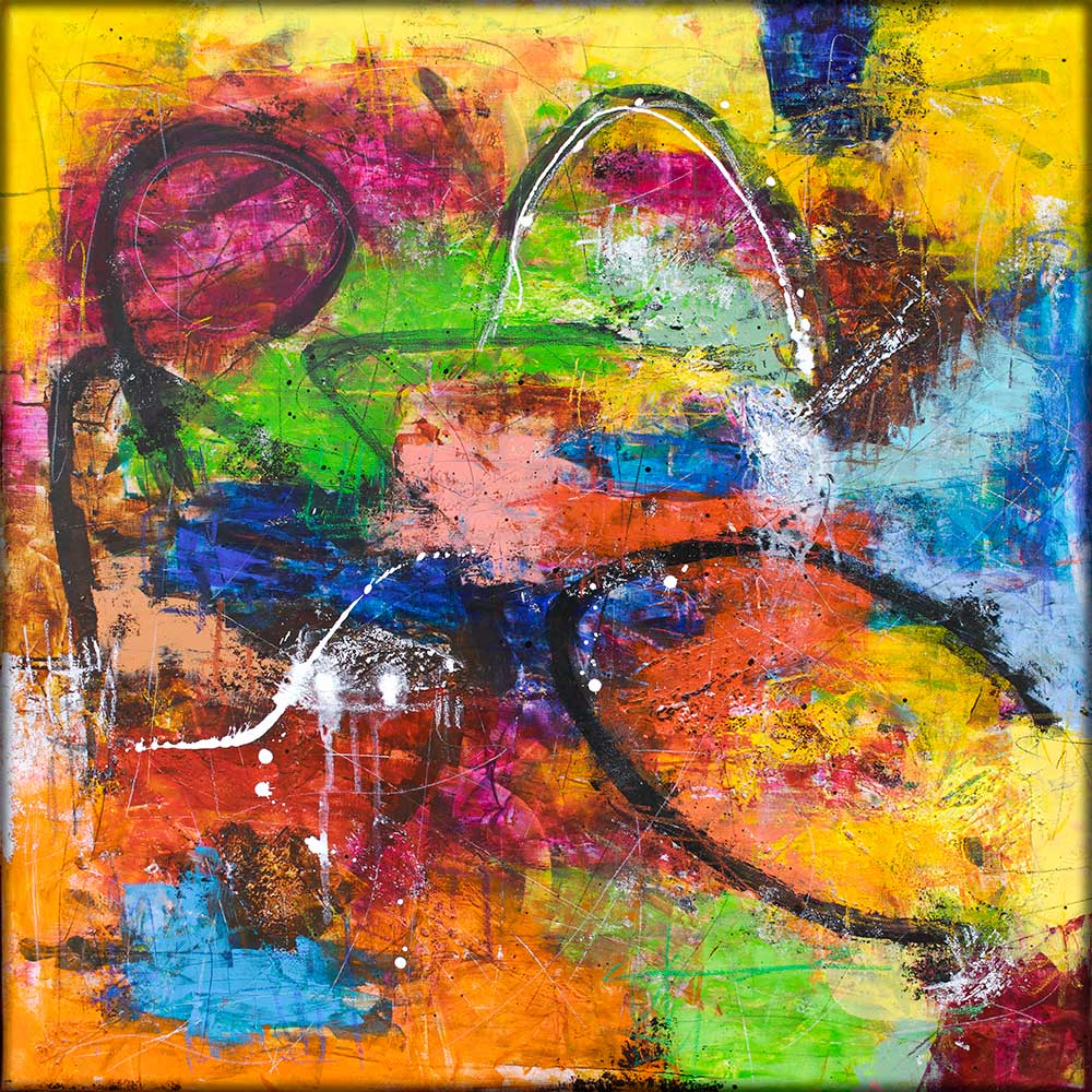 Farverne udfolder sig i en smuk sammensætning af gule, orange, pink, blå og lysegrønne nuancer. De stærke farver står i skarpe kontraster, men smelter samtidig sammen i flydende overgange, der giver værket liv og dybde. De gule og orange toner spreder varme og optimisme, mens de blå og lysegrønne tilfører balance og friskhed. Den pink farve bringer et strejf af intensitet og passion, hvilket gør værket levende og stemningsfuldt i enhver belysning.