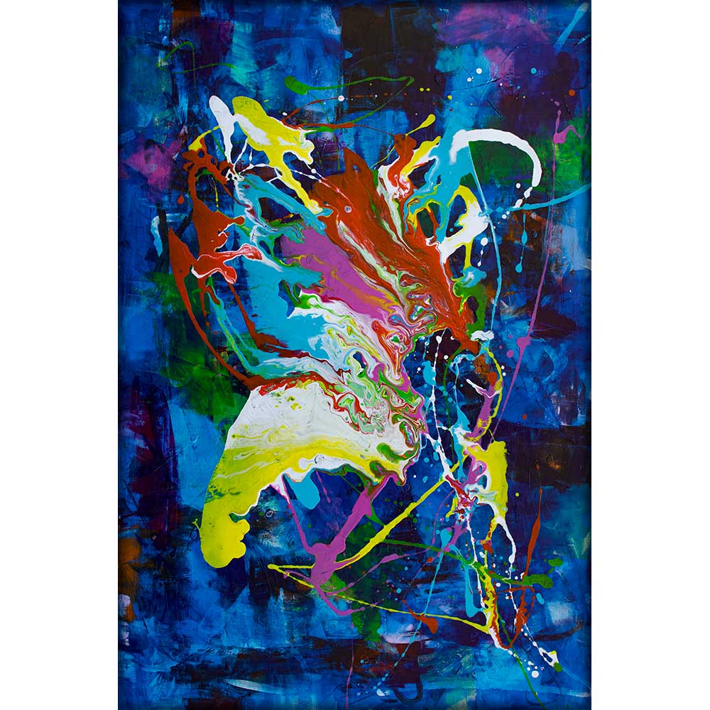 Den visuelle oplevelse forstærkes af en flot kombination af blå farver, understøttet af røde, pink, gule og grønne nuancer. Farverne står med både skarpe kontraster og bløde overgange, hvilket giver værket et dynamisk og levende udtryk. Farvesammensætningen er nøje afstemt, så hver nuance fremhæver de andre, og blikfanget bevæger sig naturligt over lærredets overflade. Kombinationen af kolde og varme toner skaber balance og dybde, mens de organiske former og linjer giver et abstrakt, men alligevel harmonisk udtryk.