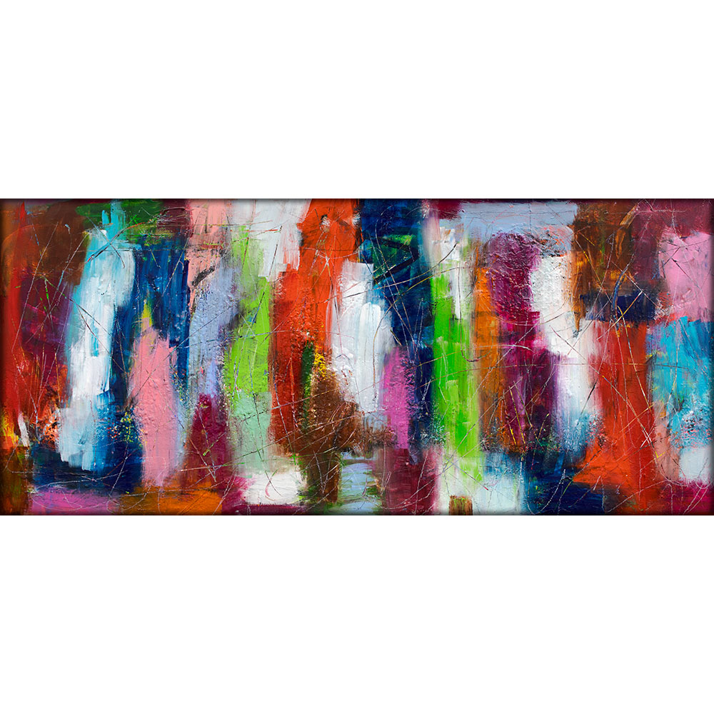 Farverne i værket danner en harmonisk og samtidig dynamisk sammensætning af blå, grønne, røde, lyserøde, lilla og brune nuancer. De mødes i både skarpe kontraster og bløde overgange, der skaber dybde og bevægelse. Den levende palet vækker følelser og stemninger til live – fra den kølige ro i de blå toner til den varme intensitet i de røde og lyserøde farver. Kombinationen giver maleriet en unik evne til at ændre karakter alt efter lys, tid på dagen og den stemning, der fylder rummet.