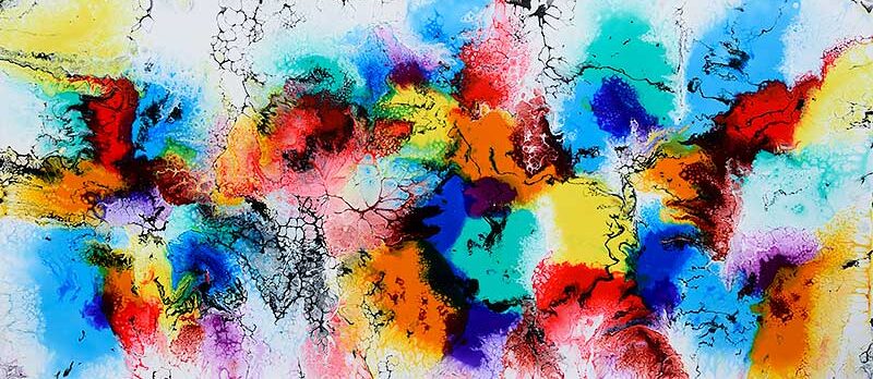 Farvespillet er centralt i værket og er sammensat med stor omhu. Her mødes varme røde og orange toner med friske grønne, klare blå og levende gule nuancer i et visuelt samspil, der både skaber skarpe kontraster og blide farveforløb. De flydende overgange mellem farverne giver et sanseligt og harmonisk udtryk, mens de markante farvebrud skaber kant og intensitet. Denne nuancerede brug af farver tilfører værket dybde og bevægelse og gør det interessant at betragte igen og igen.
