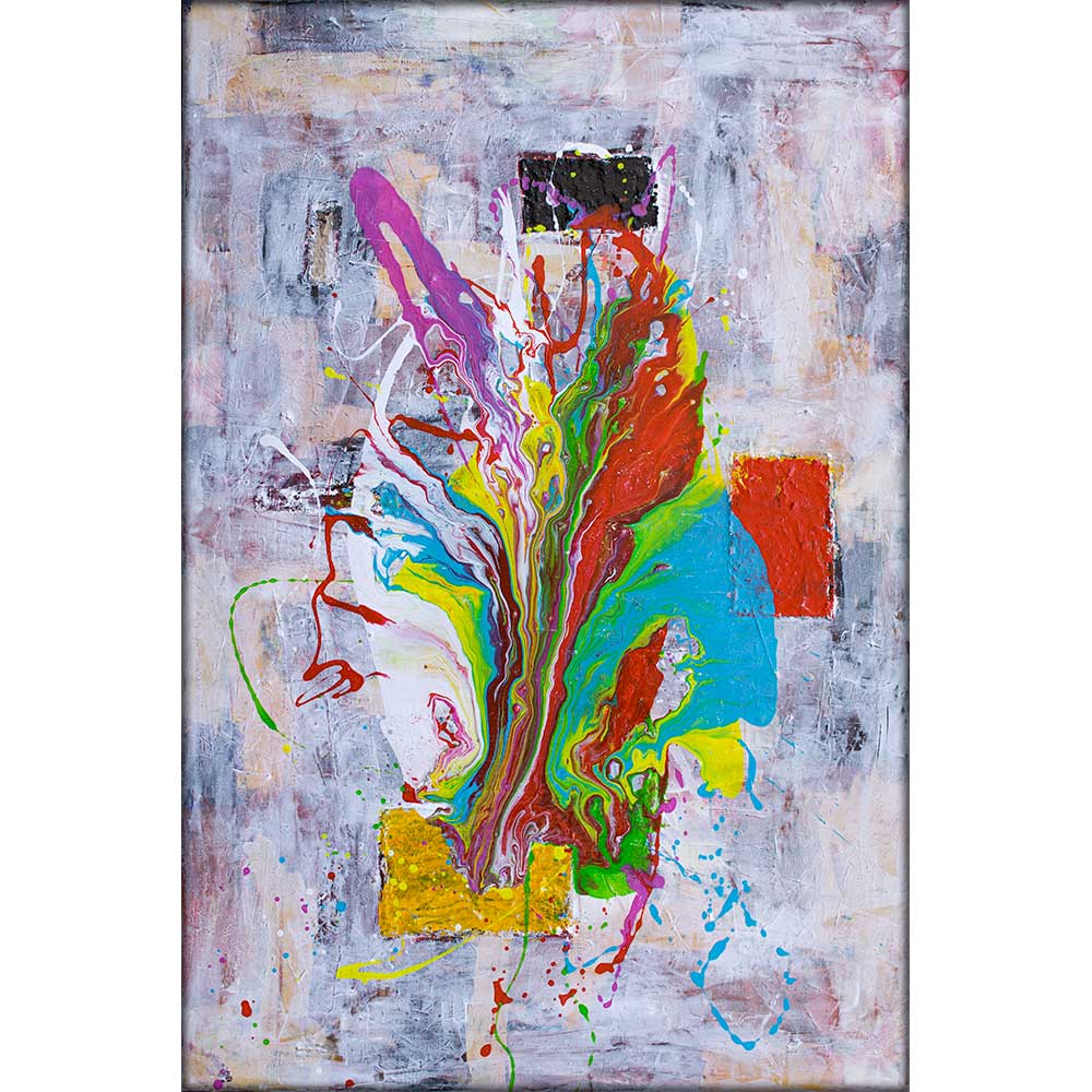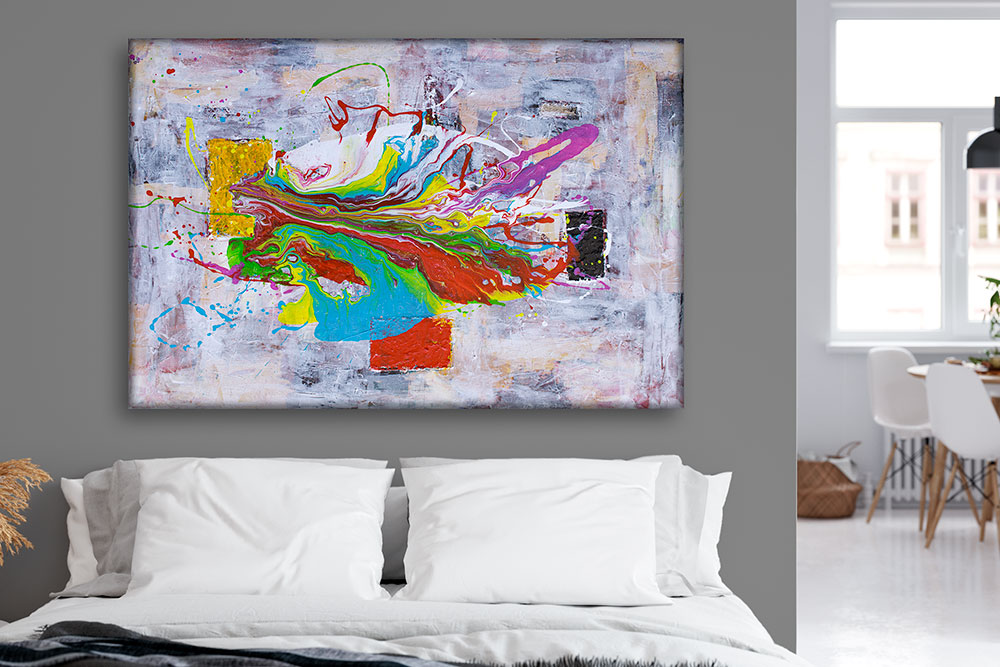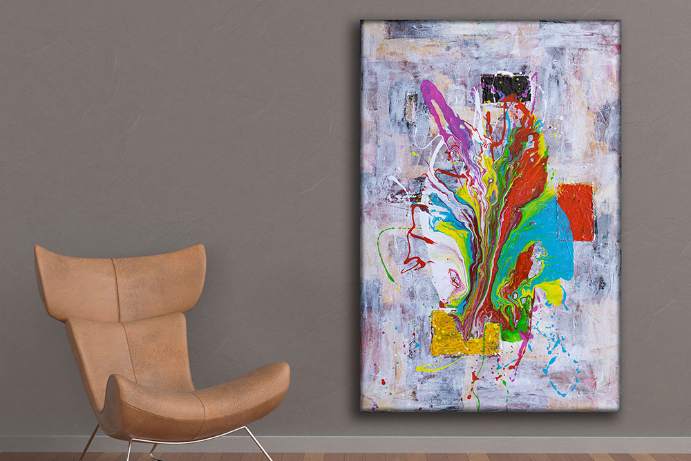 Farverne er lagt med kunstnerakrylmaling af højeste kvalitet, indeholdende rene pigmenter for maksimal dybde og lysægthed. Malingen forbliver elastisk, hvilket modvirker revnedannelse og sikrer, at farverne bevarer deres klarhed og intensitet, uanset om værket hænger i naturligt eller kunstigt lys.