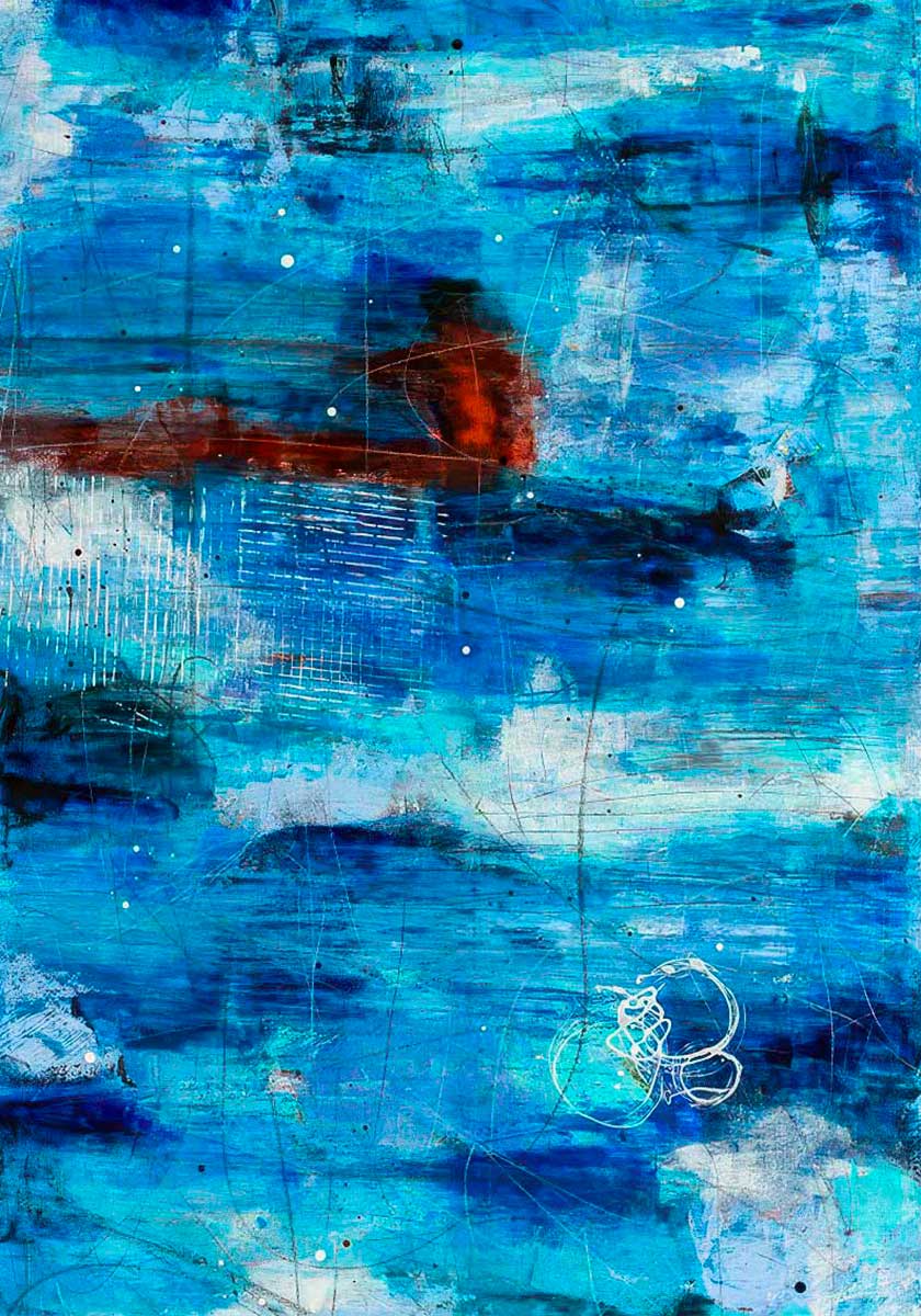 Motivet er gengivet fra et originalt ateliermaleri. Pouring teknik skaber de glidende blå overgange og den naturlige struktur i fladerne.