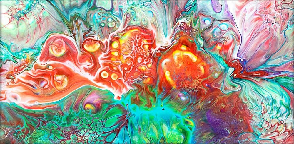 Farvesammensætningen er skabt med et balanceret, men samtidig intenst udtryk, hvor grønne, orange, lilla og gule nuancer skaber et kraftfuldt samspil. Kontrasterne mellem de klare, stærke farvefelter og de mere bløde overgange fremhæver billedets lag og struktur. De varme og kølige toner spiller smukt sammen og giver værket en både dramatisk og harmonisk dimension. Dette farvespil gør værket velegnet til at skabe blikfang i både moderne og klassiske interiører, hvor det vil fungere som et centralt fokuspunkt.